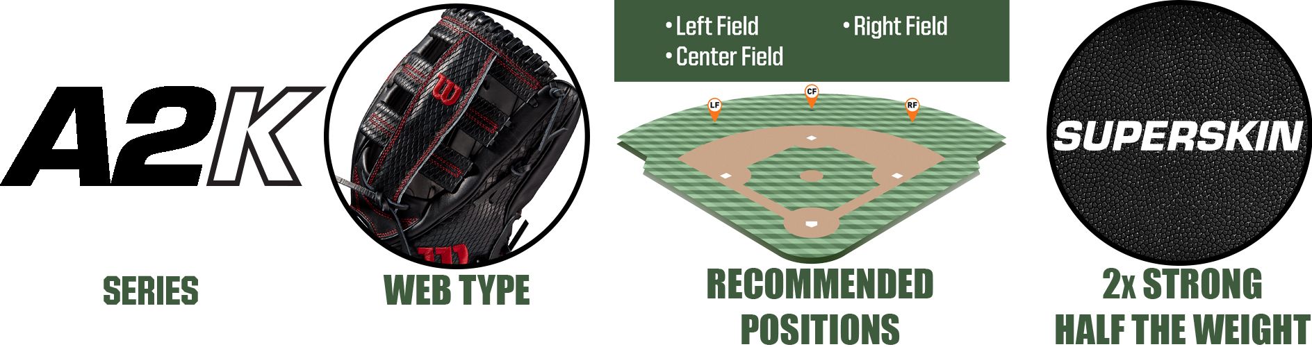 Combining time-tested materials with engineered SuperSkin™ to maximize durability and reduce overall weight, the Wilson® A2K® Series Gloves are the culmination of old and new technologies that come full-force to dominate the field this season. This 12.75’’ model is outfitted with a Single-Post, Hour-Glass Web that features a narrower heel design and shallower pocket, giving outfielders the ability to access the ball with ease once you make the play.