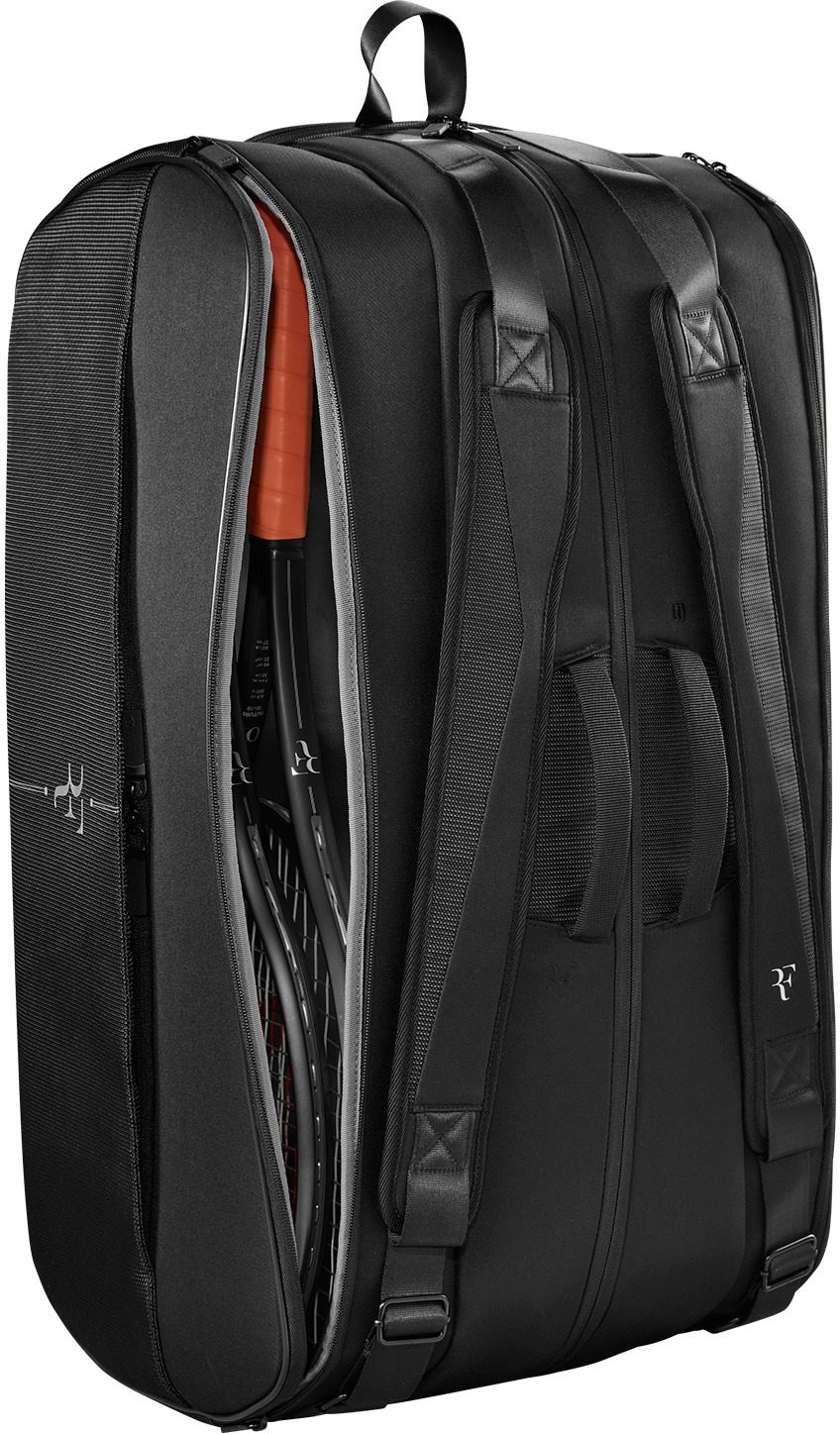 Great gear deserves special treatment. The Wilson RF Tournament Racket Bag is a pro-level bag with a design inspired by the majestic Swiss Alps, a theme that's echoed across Roger Federer's collection. This pinstripe tennis bag displays the RF logo and is detailed with premium RF zipper pulls. It's spacious enough to hold up to 15 racquets and includes two side pockets plus a shoe compartment. A Thermoguard lining in two pockets keeps rackets and string tension protected from extreme temperatures.