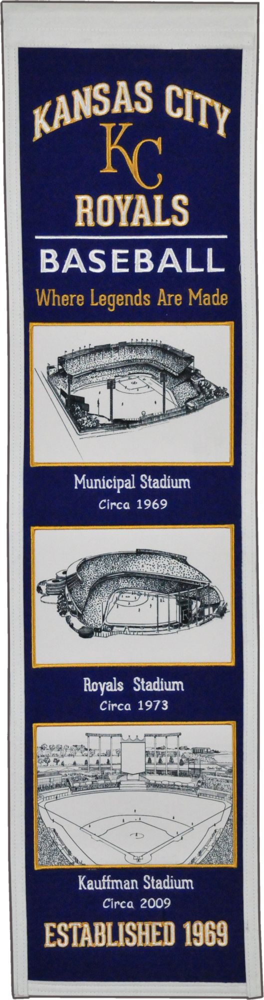 Take a walk through the history of Royals baseball without ever leaving your man cave when you hang the Winning Streak Sports® Kansas City Royals Stadium Evolution Banner.