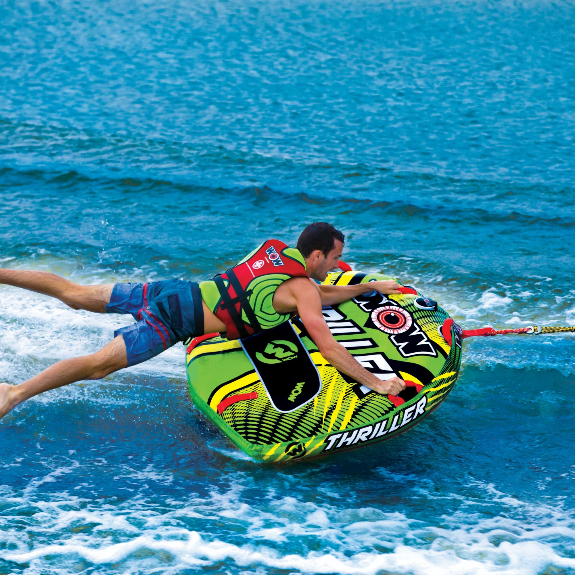 Gear up for a thrilling ride on the river this season with the WOW® Thriller 1-Person Towable Tube! This 1-person towable tube features a tapered construction for prevention against submarining as well as a Tuff Shell full nylon cover with a zipper for durability. Hold on tight to the double webbing foam handles with knuckle guards for a comfortable and secure grip as you conquer each and every wake that comes your way!