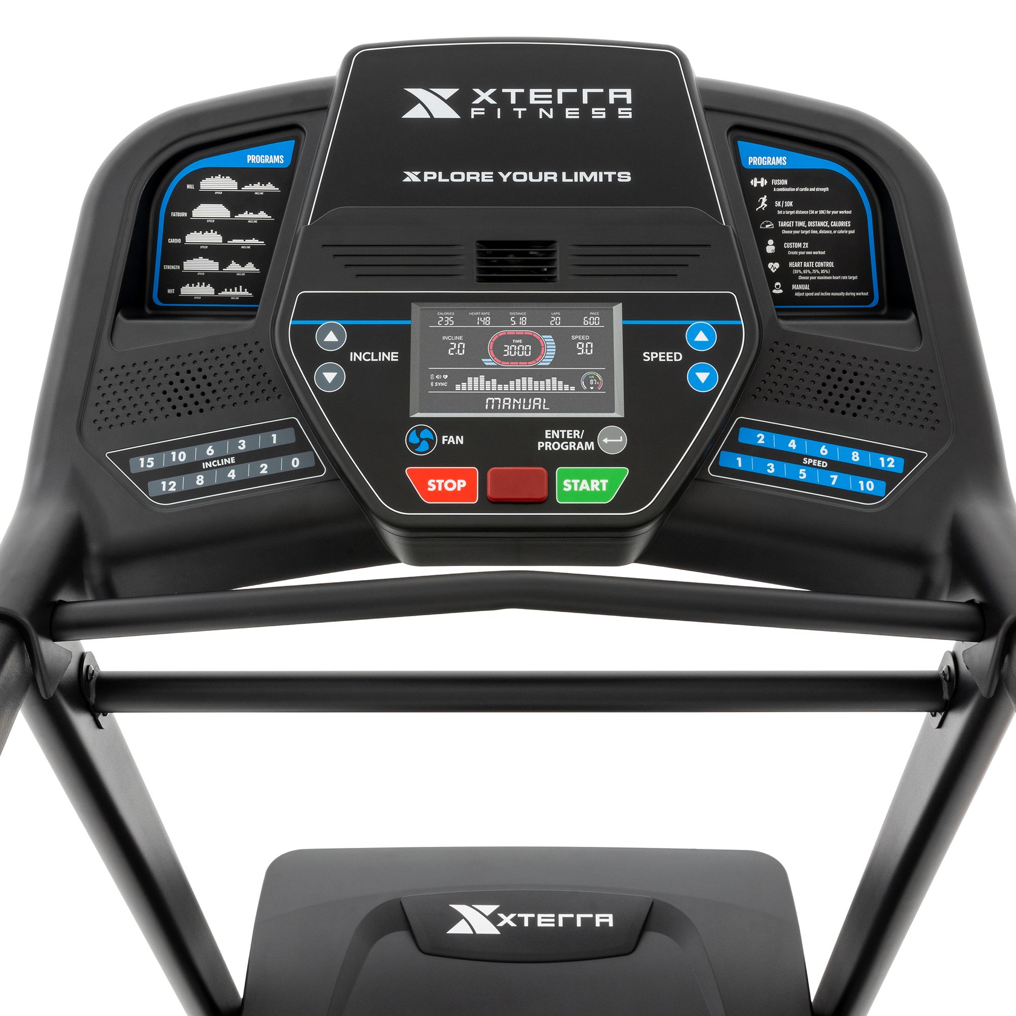 The TR85 Folding Smart Treadmill is the pinnacle treadmill in the XTERRA TR treadmill series. Jam-packed with exciting advanced features to keep you challenged and take your training to the next level. The intelligent design features a 7.5” multi-color backlit LCD display and Bluetooth with FTMS to connect to 3rd party apps like Kinomap and Zwift. Wirelessly stream your favorite tunes or workout content with the integrated Bluetooth speakers. 18 preset programs, and advanced programs like 5K, 10K, and target time, distance, and calories keep you motivated and moving. Additional features include an easy fold design, direct access speed and incline buttons, handlebar controls for both speed and incline, hand grip pulse sensors with wireless monitoring capabilities to enhance your workouts and keep you in the zone.