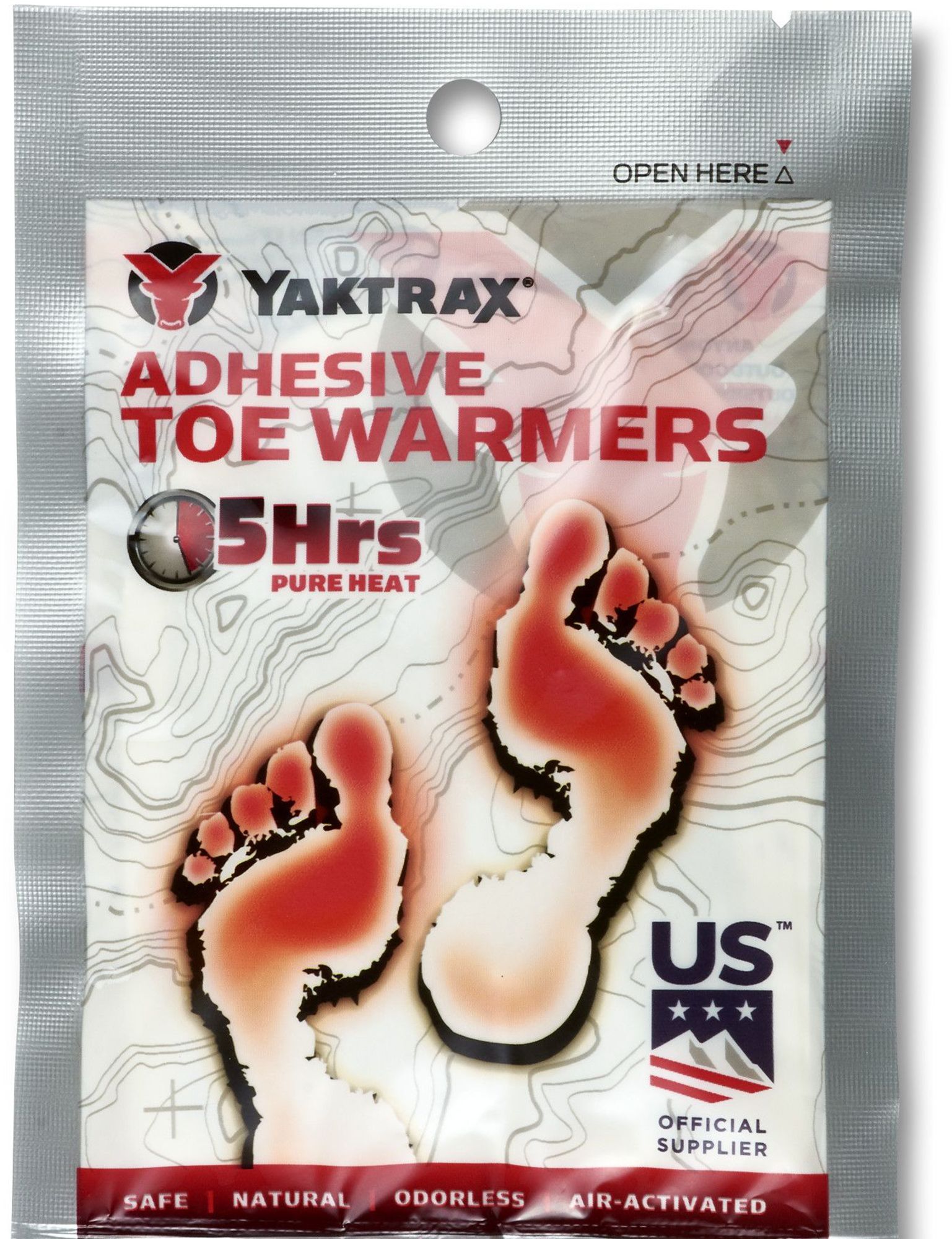 Yaktrax Disposable Adhesive Toe Warmers are a superior source of heat for anyone braving the cold. Once opened, these odorless and environmentally-safe warmers begin working within minutes, providing up to 5 hours of steady warmth. Yaktrax Adhesive Toe Warmers contain natural ingredients including iron powder, water, salt, activated charcoal, and vermiculite. Adhesive backing keeps warmers secure and in place and helps focus heat on the toes for prolonged comfort. Simply remove, peel, and stick. Yaktrax Adhesive Toe Warmers are ideal for keeping toes warm when camping, hunting, fishing, skiing, athletic events, and more.