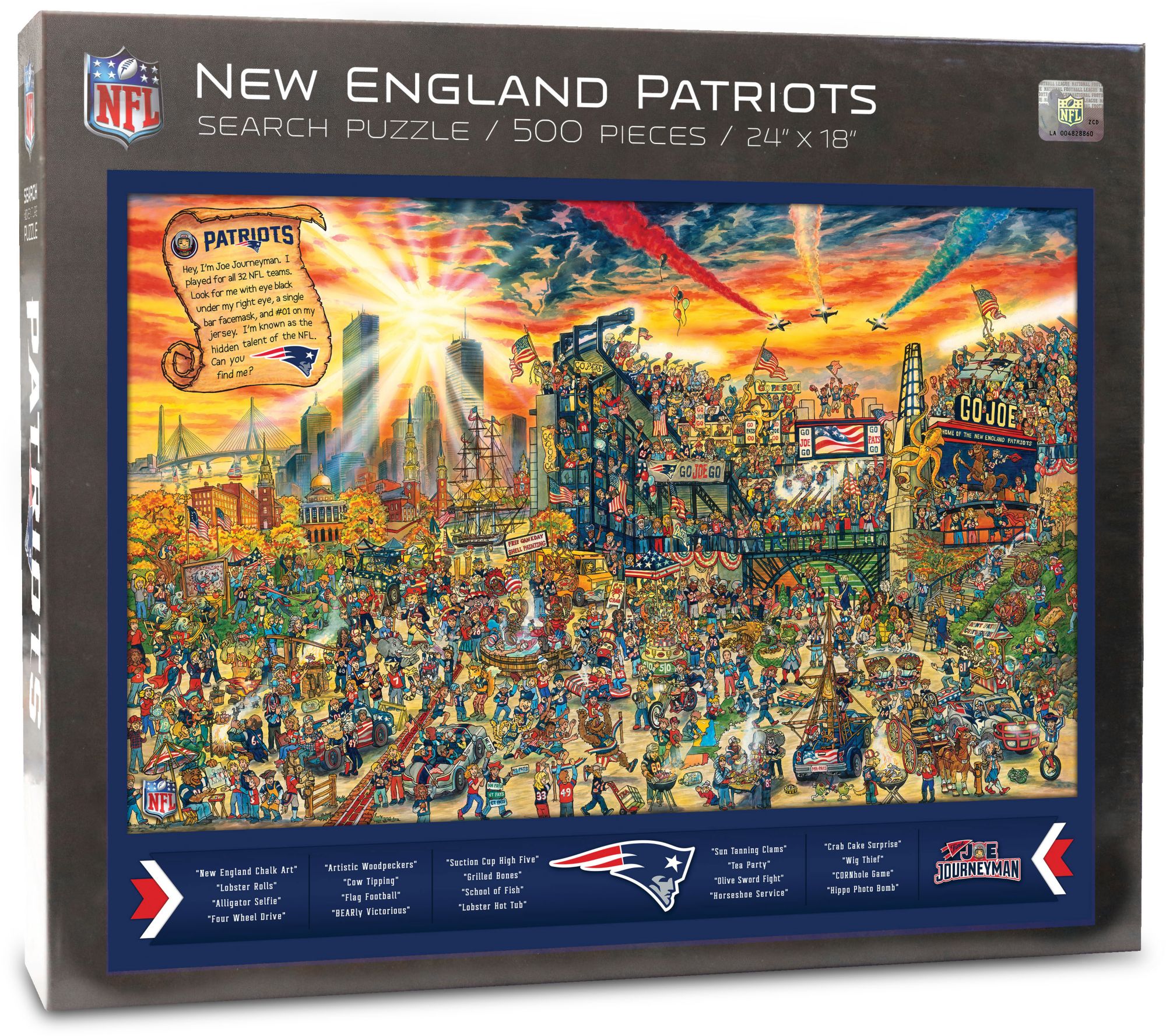 Spend a relaxing day putting together a puzzle and learning about your favorite team's city with the You The Fan® New England Patriots Find Joe Journeyman Puzzle.