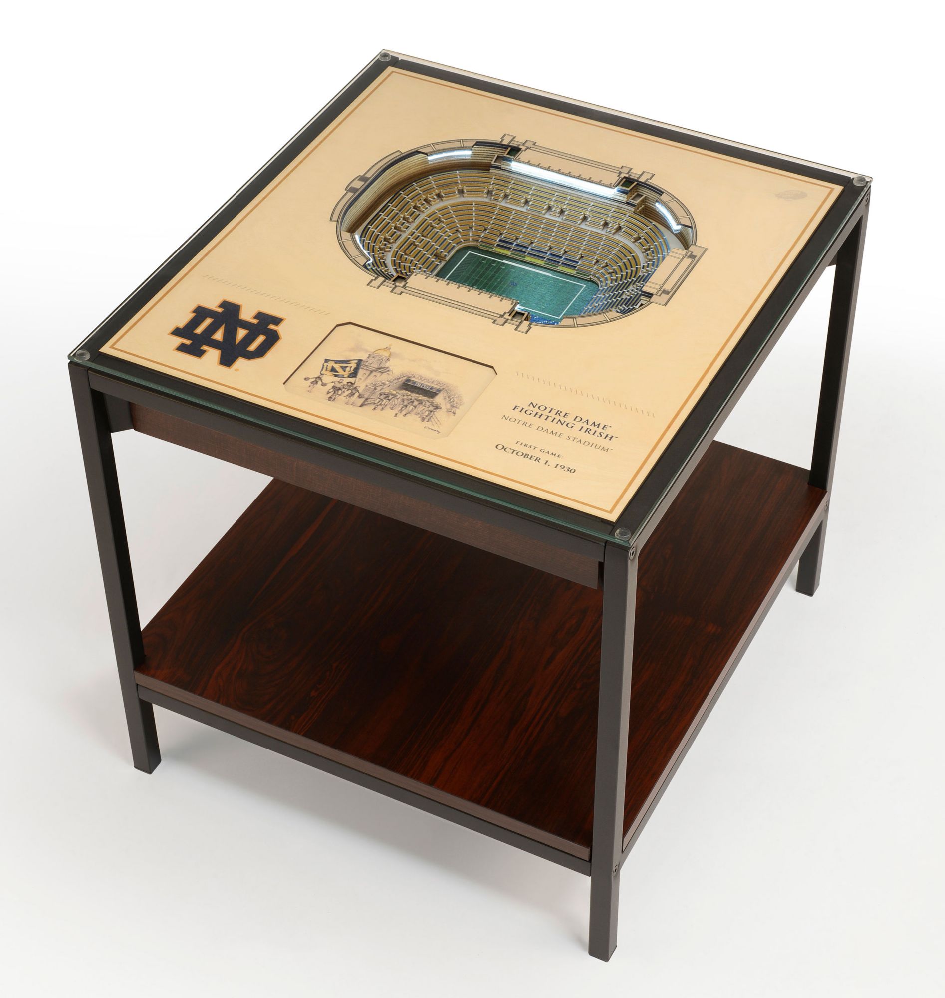 Add a unique finishing touch to your den or office and represent your team with the You The Fan® Notre Dame Fighting Irish 25-Layer StadiumViews Lighted End Table.