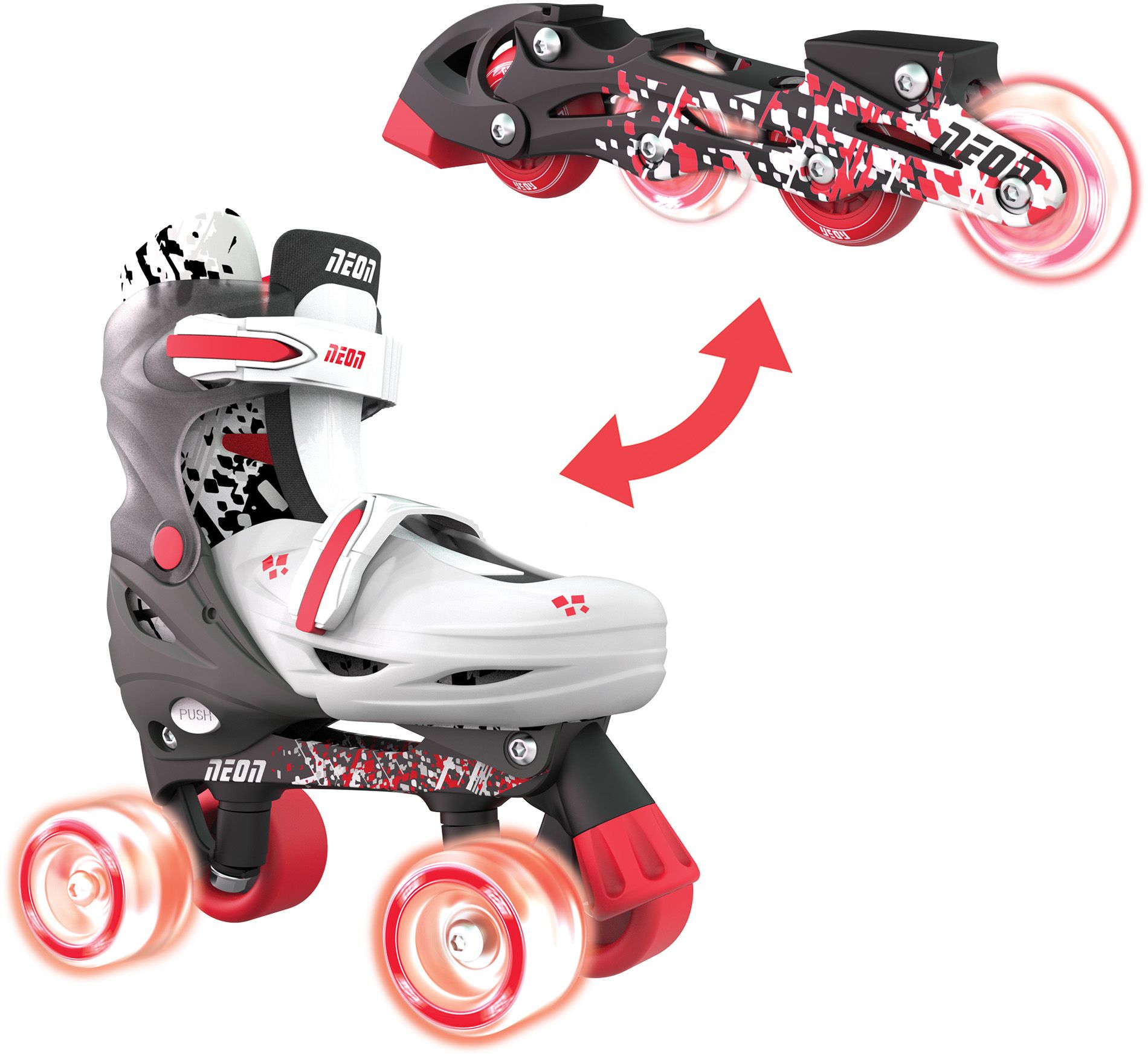 The NEON Combo Skates brings the best of both worlds. Get ready for double the fun with the NEON Skates! Switch between Inline and Quads seamlessly and watch them light up as you move – no batteries needed! Plus, they're built to last with adjustable sizing for the perfect fit!